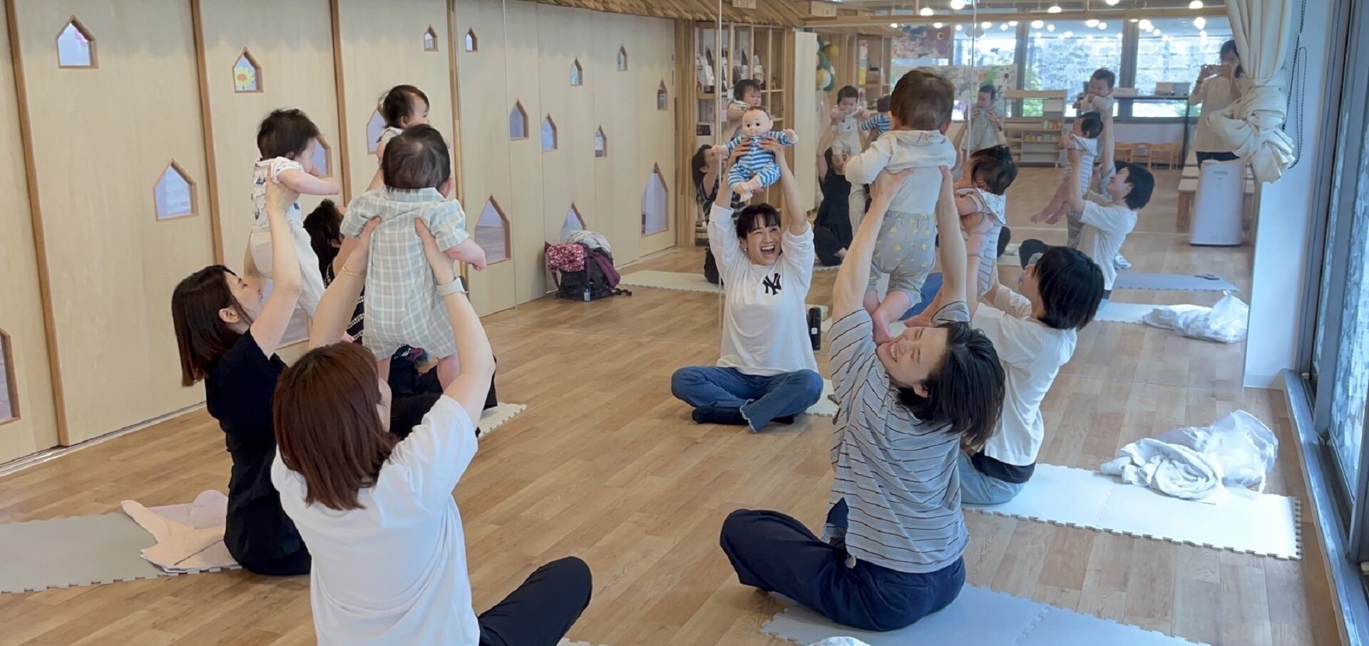 手遊び、ふれあい遊び、発達のお手伝いになる赤ちゃんヨガ、ベビーマッサージを行います。